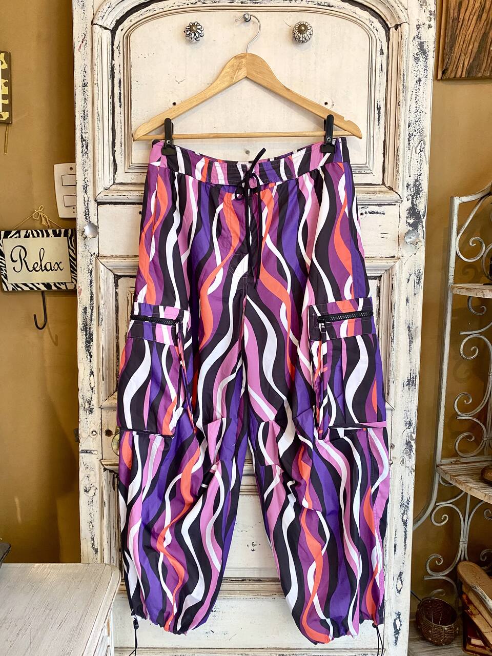Calça Estampada de Nylon, marca NV+Triya, uma collab da Nati Vozza com Triya, cor roxa/rosa